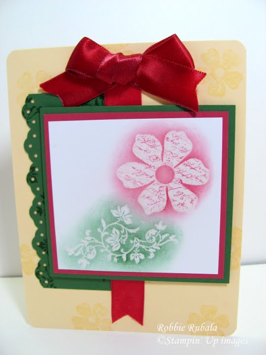 That red ribbon is so pretty. This is one of my favorite techniques but I have not used it in a long time, may have to give it another shot. Great card Robbie, thanks so much for playing along.