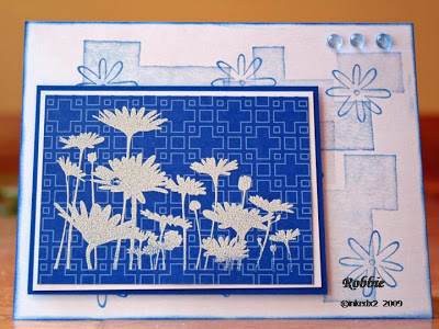 Stamps: Upsy Daisy, Sweet Shapes Paper: Brilliant Blue, white, Jersey Shore PP Ink: Brilliant Blue, Whisper White craft Accessories: white detail embossing powder, blue dew drops (Jody’s share), sponge dauber, dimensionals