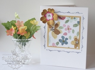 I loved the simplicity of this sketch. I decided to use some of the English Garden ds paper for the small square element. Are you getting tired of seeing all the different ways I have used it? I love the doodling in the Tin of Cards set. I decided I would use it for my card. After I had it all put together, I should have gone smaller on my square. I topped it off with a punched flower using the pansy punch and the petite petals punches. Here is my final creation.