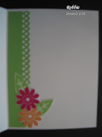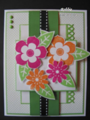 Stamps: Petal Pizzazz Paper: Green Galore, white, Rainbow Sherbert DS Ink: Green Galore, Only Orange, Pink Passion Accessories: brads (Pink Hedgehog), lattice arch border punch (Martha Stewart), grosgrain ribbon (given to me by a friend), black ribbon (Michael’s), sponge dauber, sticky tape, dimensionals