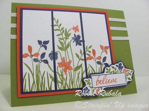 When I saw the 3 panels I thought about using a stamp set and cutting it into 3 pieces. I then saw Just Believe in my mind and knew I wanted to play with it. I stamped the large image in the center and then added the smaller image on each side. When I had finished coloring it with markers, I cut it into 3 equal pieces and added the underneath layers. I then did the sentiment box the same way and cut it out. I added the Concord Crush layer and cut around the shape. When I laid my pieces on my card it was missing something so I added some ribbon and some rhinestones. Here is my creation.