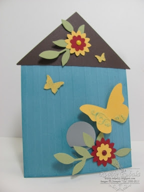 I saw a video on Stampin’ Connection an online group for Stampin’ Up demos and loved the card. I decided to make one for Donna’s challenge. The demo – Jackie Topa – made her card and added the bird punch. I don’t have the bird punch and I am more a butterfly person so I modified my house to be a butterfly house. I love how this one uses a full sheet and scores and folds. Here is my creation.