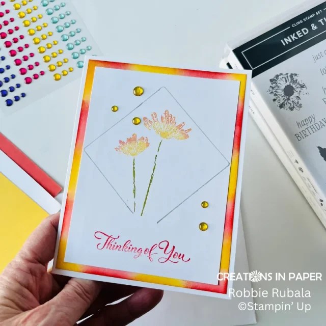 To add interest think about inking up the border around your card base with the colors used on your card for a fun colorful image. Check out this idea.