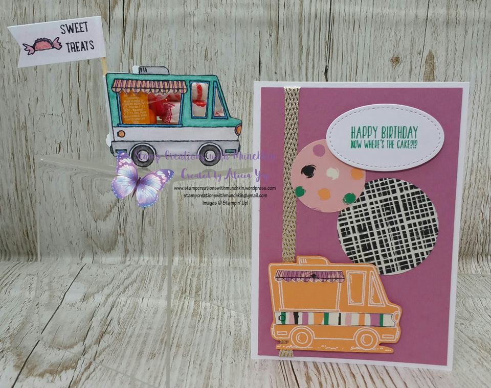 Next up on our Global Stamper tour is Alicia. Alicia’s blog is Stamp Creations with Munchkin. Alicia gave us 2 great projects using the Tasty Trucks stamp set. The first project is an adorable treat holder using the truck as the outside.