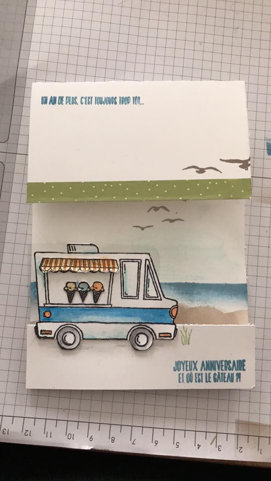 Today I am sharing the last of the Global Stampers. Today we are visiting Valerie’s blog – Les Ateliers de Val. Valerie created a fun split front card. I love how the clear panel shows the beach scene through it. Didn’t she do a fabulous job with her watercoloring? Here is her project using the Tasty Trucks stamp set.