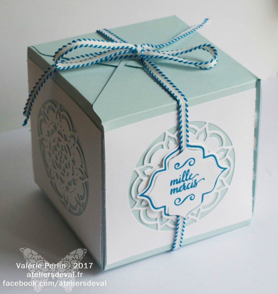 The project today was made by Valerie at Les Ateliers De Val. Valerie shares the versatility of the Eastern Palace Suite. She used the thinlits to create a cut out for her cute box. Do you see that ribbon on her box? That is one of the new ribbons in the catalog. Isn’t it fabulous? Here is Valerie’s adorable box!