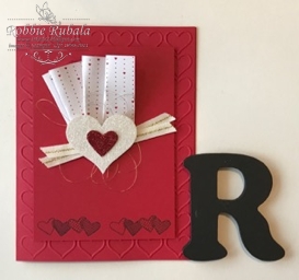 I chose to use the Sealed with Love stamp set and the Sending Love dsp.  The Real Red card base was embossed with the Happy Heart embossing folder.  A smaller panel of Real Red was stamped with the string of hearts was attached to the card base with dimensionals.  I took a piece of the Sending Love dsp and folded it back and forth on itself to create a loose fan.  Sticky tape was used to keep the fan together as well as attach it to the panel.  Next I punched the large heart from Dazzling Diamonds glimmer paper using the Sweetheart punch.  Using the heart framelit I cut out the heart from Red glimmer paper and attached it to the center of the larger heart using glue dots.  Dimensionals were added to the back and the gold thread was looped around the shape.  I then added a strip of tear & tape in the center of the heart and the strips of the natural ribbon were attached to the tape.  The heart was then added to the card front.  Here is my completed creation.