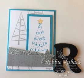 I decided to use the Twinkle Trees set and some Encore Silver ink to create a background which was added to a Tempting Turquoise card base. The dots and swirls were stamped for the panel. I used the star stamp to add the star at the top of the swirls. This panel was mounted to a piece of Tempting Turquoise. Dimensionals were added to the back and then it was placed on the right hand side of the card. A piece of Smoky Slate was cut and then stamped with the small star cluster using the same color ink. Using some silver glimmer paper I punched a star. I also cut a strip to layer. I added the silver at an angle behind the Smokey Slate and added it to my card. To finish it off I added the star on the right hand side on top of the strips. Here is my completed creation.