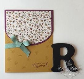 For my card I began with the colors and then added some of the dsp and ribbon. I used an oval framelit to cut the edge of the card stock and then used that edge to cut the dsp. I stamped the small flower from the stamp set using Delightful Dijon ink for a tone on tone look. After I added my dsp panel I added a bow using the ribbon from the suite. To finish it off I added a sentiment. Here is my card for our challenge this month.