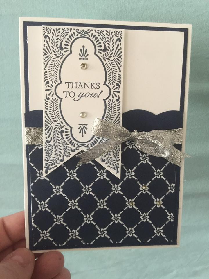 Today we have the last of our Global Stampers project this month. Our last project was created by Valerie at Les Ateliers de Val. Valerie used some of the Floral Boutique dsp and the Beautiful Banners stamp set. She also used some of the silver glitter ribbon. Here is her creation.