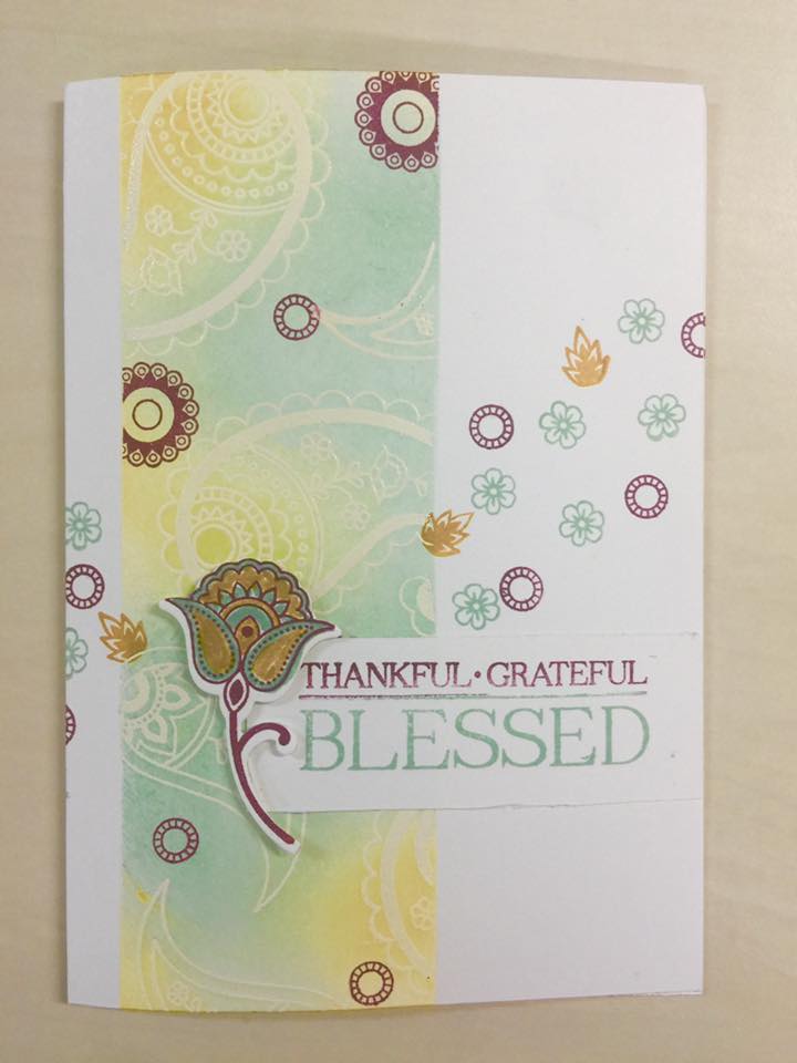 Valerie’s card is such a pretty card as she focused on the pastels more than the Rich Razzleberry. She masked off an area on her card front and did some emboss resist of the large paisley. Then she stamped some of the other images from the set. Her sentiment was colored with markers and then mounted onto the card front. She finished it off by adding a stamped flower that she colored. Here is here creation.