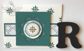 It is time for our Global Stampers shares. This month we were to use either the Eastern Palace Suite or the new In Colors. Since I had the Suite I decided to use it. The patterned paper is from the Suite also and it used the new In Color Tranquil Tide. Using a card base of Very Vanilla and the Tranquil Tide ink a background was stamped. A strip of the dsp was cut and mounted onto Tranquil Tide. This strip was added to the middle of the card front. Using a square of the Tranquil Tide and the flower framelit I cut it out. A circle punch was used to add a circle of the dsp in the center. Using the ring from the stamp set, it was stamped and embossed with gold embossing powder. The same stamp used for the background was stamped in the center of the ring and embossed with gold. This was punched out with the 1 3/8 inch circle punch. The 1 1/2 inch circle punch was used to punch a piece of the Tranquil Tide card stock. These 2 elements were layered and added to the center of the flower with dimensionals. Here is my finished creation.