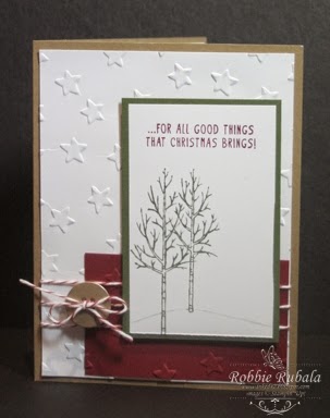 I thought of using the Cherry as the small rectangle at the bottom and emboss it with the stars embossing folder. I then thought that the background needs to be embossed also so I used the same embossing folder. I then added some Cherry Cobbler baker’s twine. Now I needed to do the main rectangle piece. I decided to use some trees and sentiment. The only thing left was the button. I used some of the gold buttons and my card was done. Here is my interpretation of both challenges.