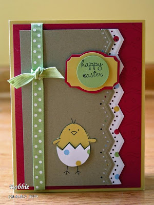 Stamps: A Good Egg Paper: Certainly Celery, Kraft, Real Red, So Saffron, Cutie Pie PP Ink: Palette Noir Black Accessories: ribbbon (Michael’s), Designer Label & 1″ circle punch, Embossed Zig Zag punch (Martha Stewart), sticky tape, dimensionals