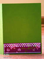 On the second card, I used the embosslet and cut out the flower in Kiwi and Raspberry Tart PP. I then layered the flower part on the Kiwi. I outlined each part with an Old Olive and Rose Red marker. I then ikned the matching stamp with the same colors and stamped repeatedly to make the border at the bottom. I punched the white layer with the lattice punch. Since you didn’t really notice the punched side I used a sponge and inked the lattice with Rose Red. For the label, I stamped the sentiment and then cut it to fit into the Round Tab punch. I punched the one side then turned the paper and punched the other side. I repeated this procedure with a piece of Rose Red that was a little larger than the white. I finished it by using Kittie’s ribbon tying tutorial for a multiple loop bow.