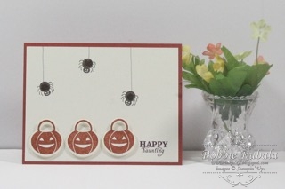 I knew I needed to keep with my Halloween theme and these colors were going to be a challenge. I was hoping the sketch would help me out. I did take the base and flipped it but not the arrow element. I looked at the images in my Halloween set and decided to try the jack-o-lantern with the Cajun Craze. I stamped them on Vanilla and then cut them out with the matching framelit. I then used the spiders to stamp a background. I had stamped them all over creating my own patterned paper. When I put the jack-o-lanterns on the page they were lost. I then decided to redo the background and just add 3 spiders. I then used my silver spica pen to add the spider thread. My card was complete. Here is what it looks like.