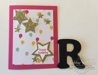 I wanted to do something different other than circles which I knew would be interpreted as balloons. I looked through my punches and decided on the star. I also wanted to use some of the fun It’s My Birthday designer series paper. I pulled out a piece of the paper I chose and cut it for my layer. I then used my medium star punch to punch 2 gold glimmer paper stars. I then used the Itty Bitty accents punch pack to punch 4 smaller stars. Then I used the sentiment from Something to Say to stamp my sentiment. I used the medium star punch to punch out the saying. Then I used the Star framelits to cut a little larger star out of the gold glimmer paper. I layered the 2 stars. I used dimensionals to add the larger stars to the card front. I then used glue dots to add the small stars. Here is my completed creation.