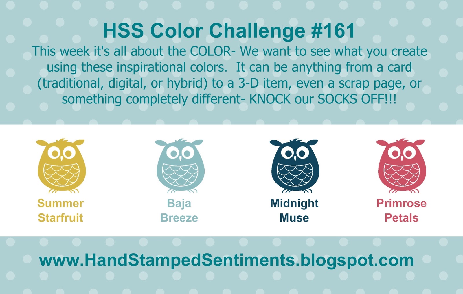 I hope you will head on over to the Hand Stamped Sentiments blog to see what the other ladies created. I am sure you will enjoy their creations. Then make sure you grab your colors and play along with us. I would love to see what you do with these colors! Thanks for looking and have a Terrific Tuesday!
