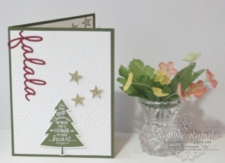 I originally approached this sketch the way it was designed, but then decided to rotate the sketch. I had stamped and die cut a tree and was going to use it for the chevron element. But no matter what I did I could not get the card to look right with the partial circle. So I decided to go in another direction. I moved the tree down to be the circle element. I then punched out some stars. I needed to address the chevron element so I went with a die cut word. Here is what my final creation looks like.
