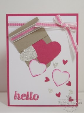 When I saw this photo I was immediately drawn to the color of the birds. It reminded me of Melon Mambo. I went with that color along with Crumb Cake. The next thing I noticed was the shape of the birds was a heart so I decided to add lots of hearts. Here is what I created for this challenge.