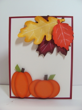 When I looked at the picture I saw the leaves and the pumpkins so that is what I went with for my card. I used our new Autumn Accents Bigz die to cut out some leaves and my punches to create some pumpkins. I used a white gel pen to add some veins to my leaves. Here is my creation.