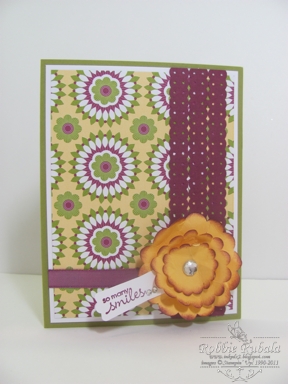 I saw this as a quick and easy sketch so I went with that idea. I decided to use some of my designer series paper that I had not used in a while. I saw the vertical stripe and wanted to try something different. I used the ribbon punch to make 3 strips which I attached next to each other. I then added some ribbon for the horizontal stripe. I used 3 different sizes of scallop circle punches to make my flower. I then stamped the sentiment and punched it out with the modern label punch. I attached it to the flower using glue dots. Here is my creation.