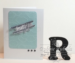 I just got some new stamps from the Occasions and Sale-abration catalogs. I decided to use one of the sets on this sketch. When I looked at the center panel I thought about the clouds embossing folder we use to have the new set Sky is the Limit. I thought they would be perfect and make a great card. I embossed the Soft Sky panel and then took the Whisper White craft pad and swiped it it across the raised dots. This made the clouds pop. I stamped the plane using Basic Gray. I then cut it out. I used some Crystal Effects on the propeller. When it was dry I attached it to the panel using dimensionals. To address the flag shapes I stamped the cloud stamp on each side. I then attached the embosssed panel and added some candy dots. Here is what my final creation looks like.