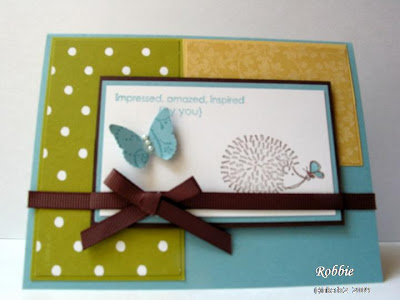 Stamps: Fun & Fast Notes, Sweet Little Sentiments Paper: Baja Breeze, Chocolate Chip, Kiwi Kiss, So Saffron, white, Bella Rose DS, Le Jardin DS Ink: Baja Breeze, Chocolate Chip Accessories: ribbon (Pink Hedgehog), butterfly punch (Martha Stewart), Rhinestone Stickers (Michael’s), white & clear Sakura Gelly Roll pen, aqua painter, sticky tape, dimensionals