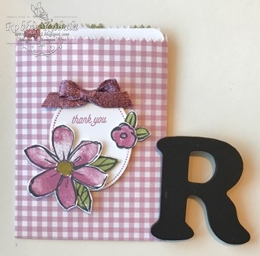 She had used card stock to make her bag. I opted to use some of the Succulent Garden dsp. I cut my bag out of the dsp and put it together. Then I needed to address the center panel. The That’s Tag bundle was perfect for my bag. The outline was stamped and then it was cut out. I stamped the sentiment inside. The tag was added to my bag using dimensionals. I used some of the Sweet Sugarplum sparkle ribbon from the Holiday catalog to tie a bow and add to the top to hid the hole the tag cut. Using the Garden in Bloom stamp set I stamped the large flower and leaves as well as the small flower and leaves and fussy cut them out. The leaves were added to the flowers using glue dots and the center of the flower was colored with the Gold Wink of Stella. The flowers were added to the tag using dimensionals.