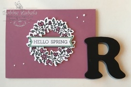 I decided to use the retiring set Circle of Spring for the watercolor background image in the sketch. I stamped it using Versamark and Memento Tuxedo Black ink. Using my Mint Macaron and Sweet Sugarplum markers to color in my wreath. Then I used the Wonderful Wreath framelits to cut out my wreath. I mounted this onto a Sweet Sugarplum card base using dimensionals. The sentiment came from Crazy About You. I am going to miss this set when it retires as I use it a lot. The ends were flagged and then I mounted it onto a piece of Mint Macaron. It was added to the wreath on the card with dimensionals. To finish off my card, I added some Nuvo drops. Here is my clean and simple creation.