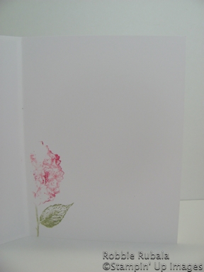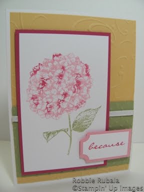 This is a pretty color combination. I decided to use the Because I Care set. I colored the hydrangea with my Pretty in Pink marker and then added highlights with my Rose Red marker. I used 2 different embossing folders – the polka dots and perfect details. Here is my creation.