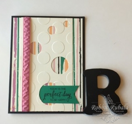 I chose a black card base and attached a piece of Playful Palette ds paper. I cut a piece of Very Vanilla card stock and using my circle punches to punch some holes in the card stock. I then used my large polka dot embossing folder to emboss the panel. A piece of Sweet Sugarplum ruched ribbon was added down the side. I attached this over top the ds paper with sticky tape. My sentiment was stamped on a piece of Cucumber Crush card stock. I used the Banner Triple punch to flag the end of the strip. To apply it to my card, I added some glue dots to the straight end and inserted it into the punched circle and stuck it down. Here is my completed creation.
