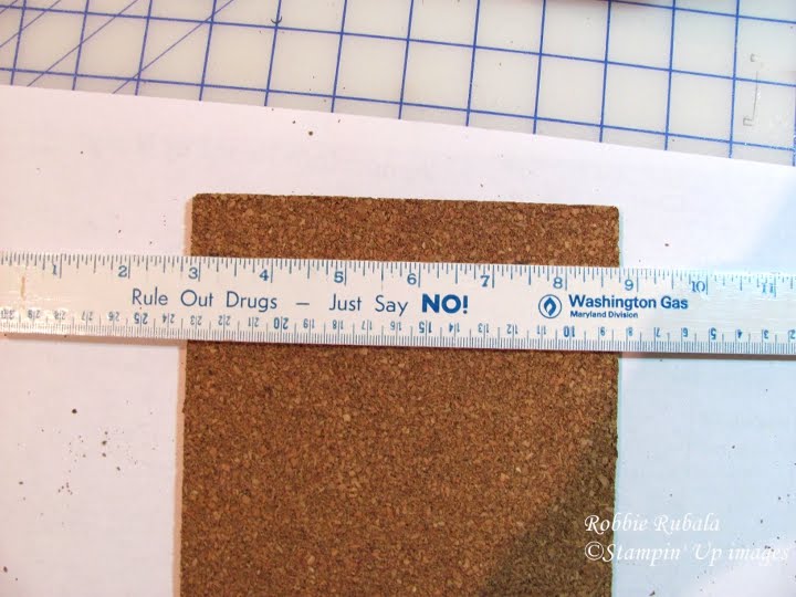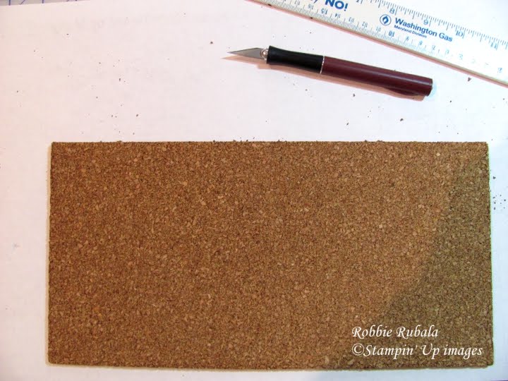 Determine the size of corkboard you will need. I made mine wide enough to cover the edge of my designer series paper on the other side. Then using a ruler mark the cork in several places. Use your ruler and your marked places to create a straight lin