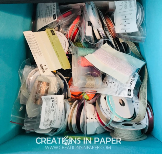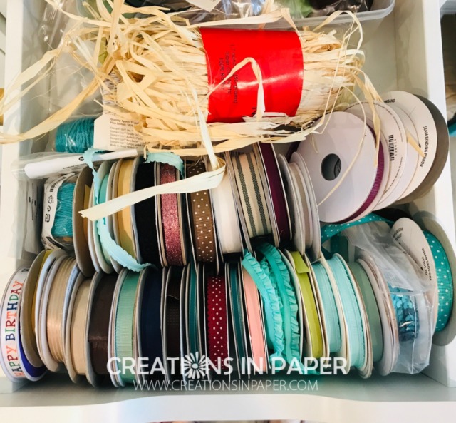 There are many ways to store your ribbon and you need to find the method that works for you. You can store it by types of ribbon – I shared an article on this topic a few days ago -, colors, or in my case I store it by what is current and what is retired.