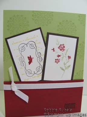 I liked this sketch when I saw it and had a picture in my mind of what I wanted the 2 panels to look like. The rest was just a matter of using the color challenge to complete the card. I used a set I have loved for a while but haven’t used it much. I fell in love with so many samples that used the Charming set that when SU had it on special and it was also going to be in this year’s catalog I bought it right away. This is a great set and once you see my card you will agree! lol Here is my creation.