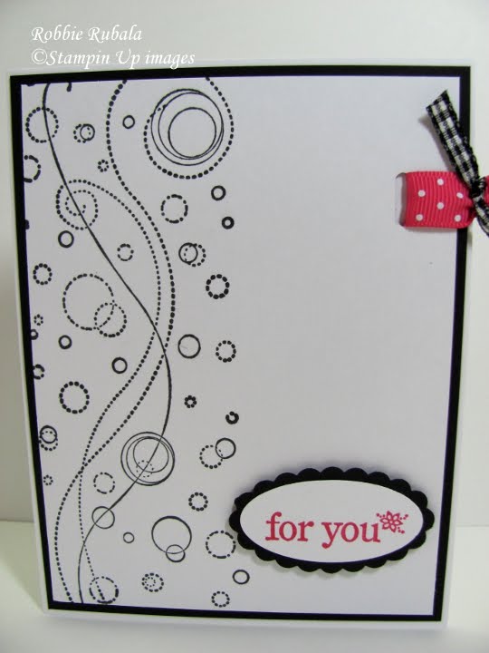 Stamps: One of a Kind Paper: Basic Black, white Ink: Basic Black, Melon Mambo Accessories: Whimsy wheel, large – scallop oval – slot punches, Melon Mambo polka dot ribbon, Black gingham ribbon, sticky tape, dimensionals