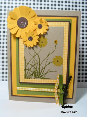 I began with selecting my color challenge. I decided to use the colors from the Color Throwdown blog. You were to use dark brown (Chocolate Chip), Kraft, Old Olive, dark yellow (Summer Sun). When I saw those colors I just knew I needed to make black eyed susan’s. Next I went looking for a sketch that would lend itself to what I had in mind. I found a great sketch Makeesha Byl’s blog Inkspirations. I then set about creating my black eyed susan’s. For the large one I used the scallop circle punch. The small ones were created with the boho blossoms punch.