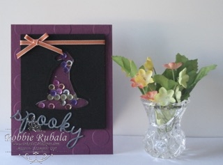 At Convention I won the Howl-o-ween Treat stamp set in a prize patrol. I did not win the matching framelits so I had to order them. I thought it would be fun to use the witch hat framelit as the shape for my shaker card. I cut the hat out of black. I decided to make the base of the card Rich Razzleberry which I embossed with the large polka dot embossing folder. I set up the base for my shaker card and then added my sequins. I decided to use some green sequins I had as the band on the hat. I glued them in place with glue dots and then added some other colors I had. Before I added my top layer with my window sheet over the opening, I attached some Pumpkin Pie 1/8″ taffeta ribbon I had. I then added my top to my base using some Multipurpose Liquid Glue and my shaker card was done. To address the 3 circle elements in the lower left corner, I decided to use the word Spooky from the Seasonal Frame thinlits die. When I laid it on my card you could not see it since I cut it our of black and the shaker frame was black. I pulled out my white craft ink and sponged it. Now you could see the word. I added it in the lower left hand corner in place of the 3 circles. Here is what my final creation looks like.