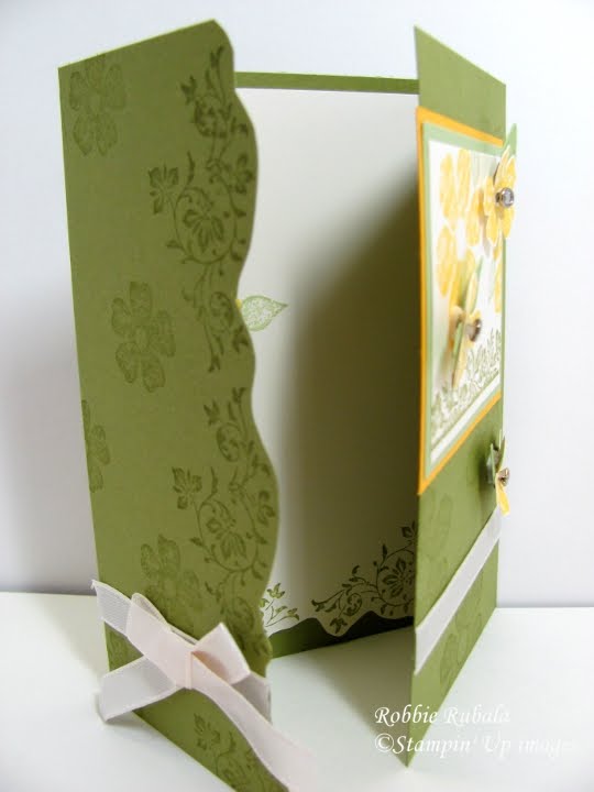 The first card I made was for the color challenge at The Color Dare blog. You were to use Certainly Celery, Old Olive, Summer Sun, and Very Vanilla. I also used the sketch challenge at Stamping 411. Finally since I was planning on doing flowers I was able to have the card fit the blossoms challenge at Our Creative Corner blog. I wanted something different so I played with the gate fold card and here is what I came up with. The flowered panel at the top holds the left flap closed. I stamped the vine from Vintage Vogue down the edge and followed the vine to cut a decorative edge. I stamped and cut out the small flower and used crystal brads for the center. I like the way it turned out. Here is the sketch and my creation.