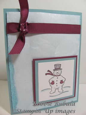 My card today so the card we will make tonight in our technique class. It is the ice crystals background. It is a technique I learned at Technique Junkies. It is fun and easy but I learned a few things (check out the mistake down the left hand side of the paper). I hope you can see the crystal texture on the background. Here is my creation.