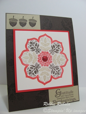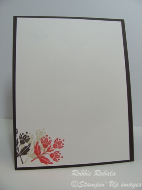 I used the My Create Ink – Color Lab site to find some colors to combine with Poppy Parade. They suggested Early Espresso and River Rock so I decided to give them a try. I colored the large image with markers and stamped it on scrap paper. I did not like the look (I had used River Rock in the center, Poppy Parade for the flowers and leaves, and Early Espresso for the outside ouline) so I cleaned my stamp and recolored in. I like the way this one turned out so I used it on my card. I have to admit that when I finished this card I wasn’t certain whether I liked it or not but the more I look at it the more I like it. Here is my creation.