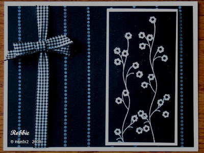 Stamps: Just Vine (retired), Faux Ribbon (Papertrey Ink) Paper: Basic Black, White Ink: White Craft Accessories: Ribbon (Michael’s)Check back later as I am going to work on the Mojo Monday sketch now. Thanks for looking and have a great afternoon!
