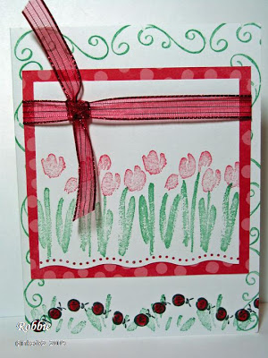 Stamps: Sweet Shapes, Spring Garden, Itty Bitty Borders (all retired) Paper: white, dotted background (not sure where I got this) Ink: Garden Green, Real Red, Basic Black Accessories: wavy border punch (EK Success), Real Red marker, ribbon (Pink Hedgehog), sticky tape