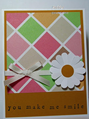 Stamps: Simple Sayings II (retired) Paper: More Mustard, white, checked patterned paper (not sure where I got it) Ink: Basic Black Accessories: scallop circle punch, 5/8″ circle punch, ribbon (Michael’s), Zots, sticky tape, dimensionals