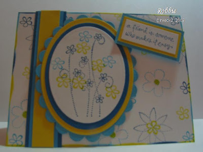 My card today fits into 2 challenges. I used Tracy’s sketch from the Eat Sleep Stamp blog. I paired it up with the inspiration challenge from the new blog Inkspirations. I used the colors from the inspiration challenge which were Pacific Point, Tempting Turquoise, and YoYo Yellow. Sometimes when I am not sure how to add some “pop” to a card I will use the colors from the card and sponge a rainbow effect around the edge. I like this look especially when your card is only a few layers. Here is the sketch, inspiration, and my creation.