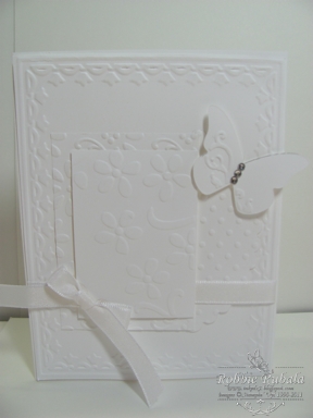 Isn’t it a pretty card? Would make a great shower card or wedding card. I used 4 different embossing folders. They all go together very will. Thanks for looking and have a Marvelous Monday!