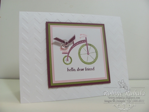 I loved this color combination and decided to use the bicycle from the Moving Forward set. I colored the image with my markers to get the different colors on the bike. I loved the look of the stamped image and decided to keep my card clean and simple. Here is my creation.