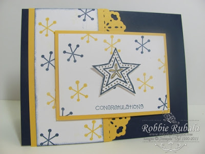 Now I need a set. I don’t have anything that would be considered graduation so I approached it from the “Congratulations” or “Celebrate” angle. I found the perfect image in the Fun & Fast notes set. This set is retiring at the end of this month so I needed to use it. So I had to create my card using blue and yellow. Here is what I created.