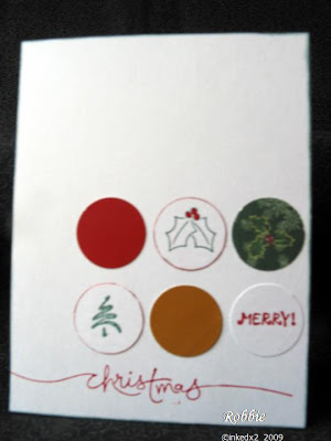 Stamps: Heard from the Heart, Bitty Bolds, hostess stamps, Mini Sampler (TAC) Paper: white, Holly (JoAnn’s), paint chips Ink: Handsome Hunter, Real Red Accessories: Real Red marker, 1″ circle punch, sponge dauber