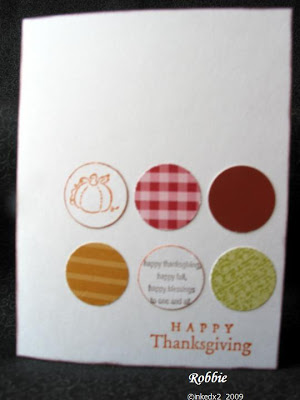 Stamps: Happy Blessings, All Year Cheer III, Mini Sampler (TAC) Paper: white, Bella Rose DS, 6 x 6 Patterns Pack, paint chip Ink: Chocolate Chip, Pumpkin Pie Accessories: 1 ” circle punch, sponge dauber